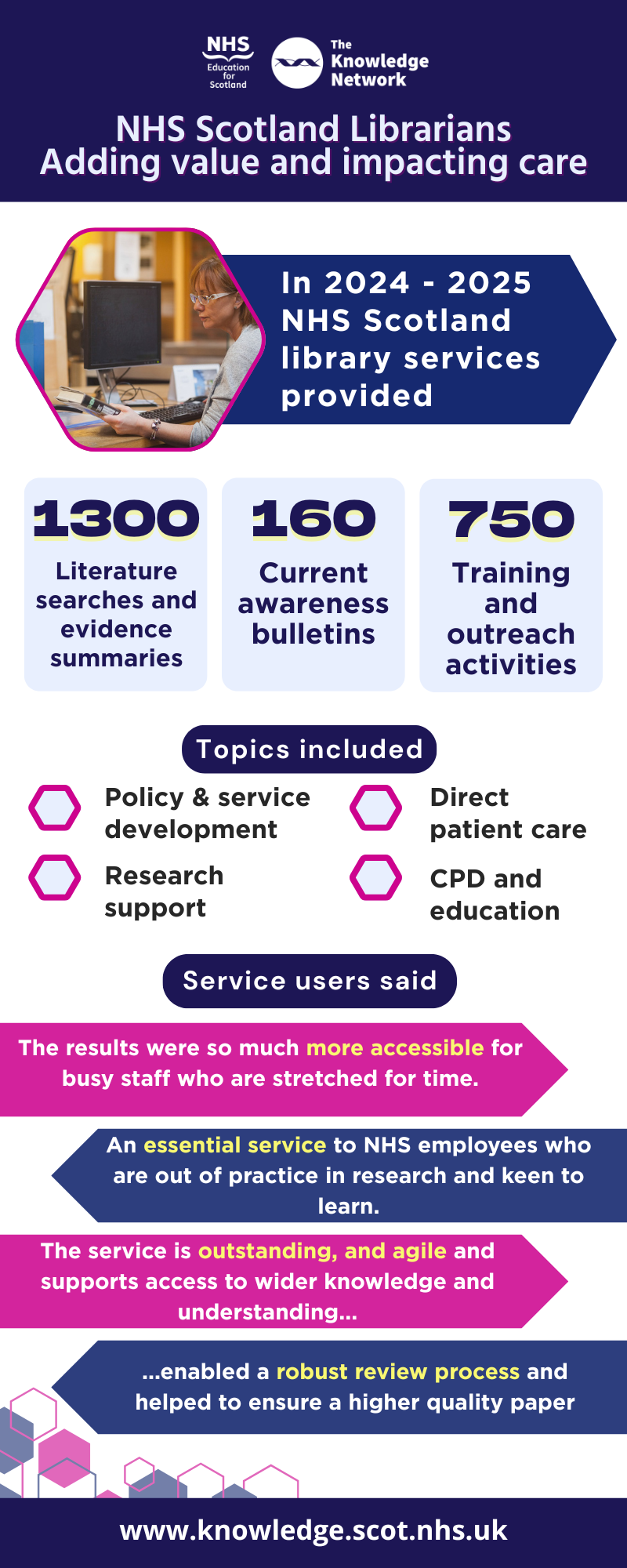 The NHS Scotland libraries value and impact report 2024/25 report is now available on The Knowledge Network.